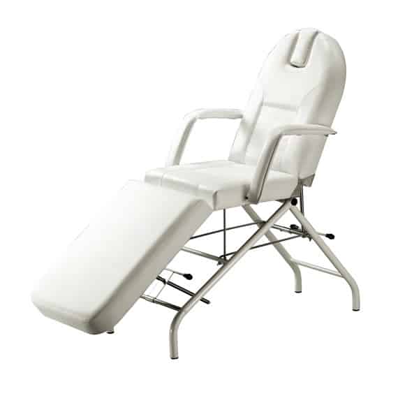 Lettino estetica a due snodi dotato di aste autobloccanti per la regolazione dei cuscini. La struttura è in metallo verniciato e l’imbottitura è rivestita in skai. È completo di braccioli estraibili a distacco rapido, per garantire la massima praticità. Dimensioni : (54 x 188 x 66) L x P x A Colore di serie: bianco Carico di lavoro massimale: 150 Kg