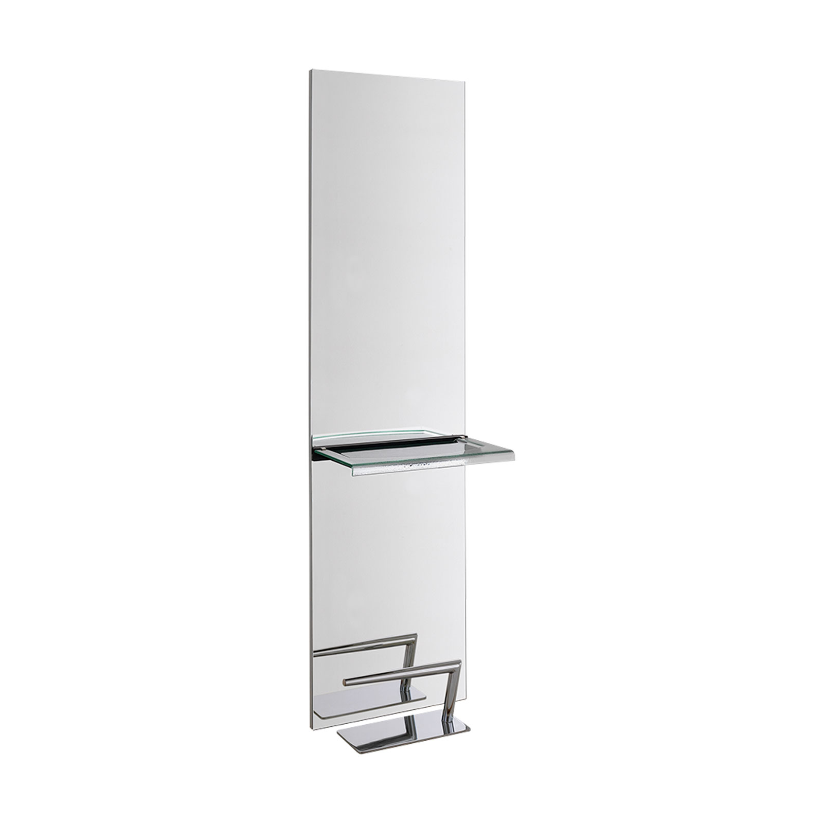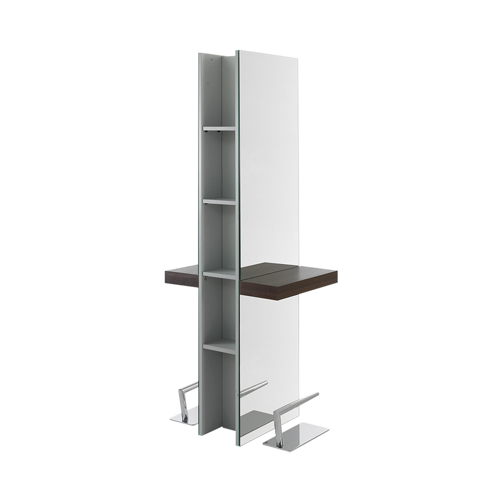 Posto lavoro parrucchiere parete o isola “full image” con piano d’appoggio a scelta tra i modelli proposti. Mensoline laterali porta prodotti nella versione isola.
